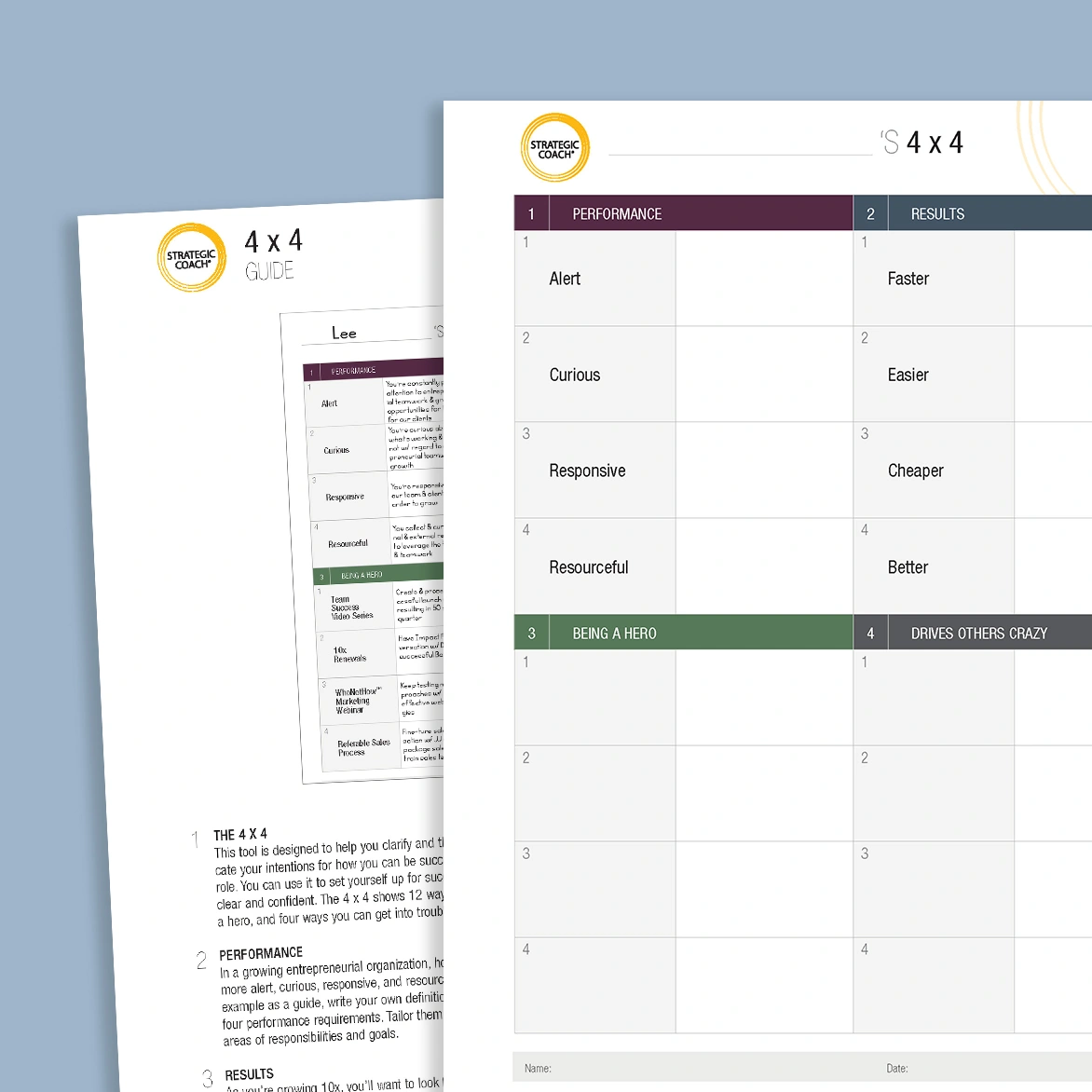 Designed to help you clarify and communicate your expectations to team members, the 4x4 is a valuable tool for any entrepreneur looking to work more effectively with others and set their team members up for success. By clearly articulating what both excellent and poor performance looks like, team members can feel confident and free to use their unique skills to execute your vision in their own way. This not only gives them space for creativity, it prevents them from wasting energy trying to guess what you’re looking for.